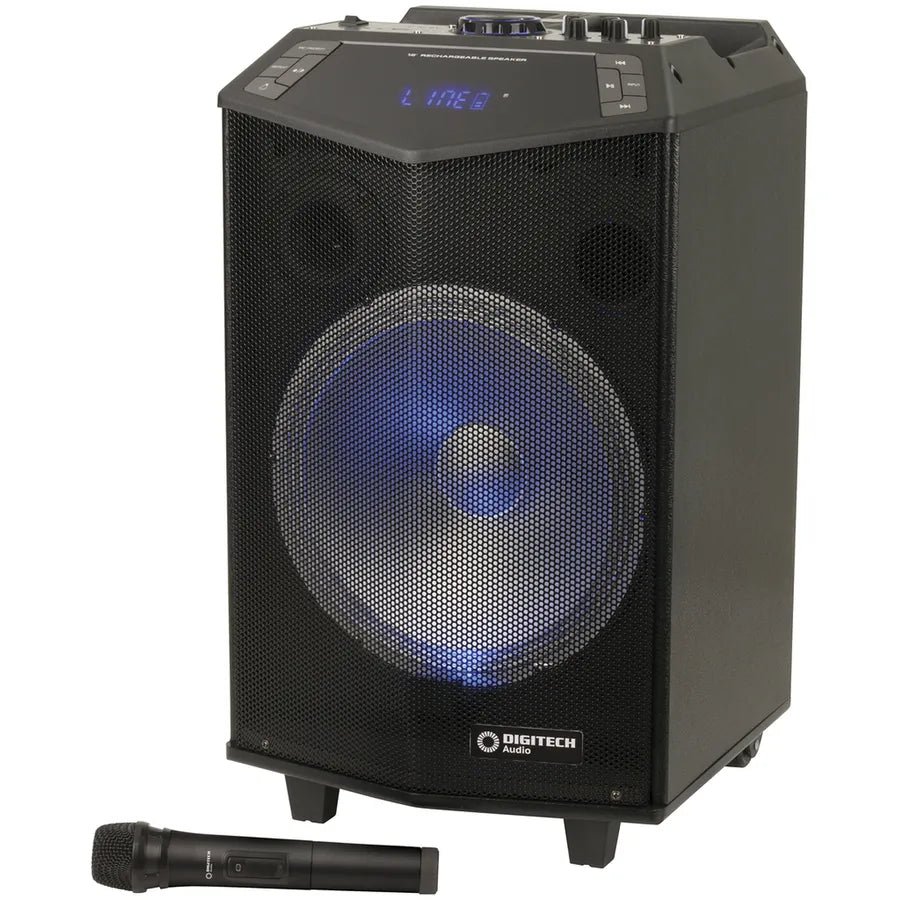 This portable 12” speaker has an in-built amplifier and rechargeable battery which is perfect for parties, functions or karaoke nights. Play your music from a Bluetooth® source, USB flash drive, microSD card or auxiliary input.